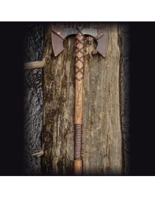 Cette magnifique hache viking en acier à haute teneur en carbone avec son manche en bois décoré apportera un plus à votre collection. (Hache vendue seule)