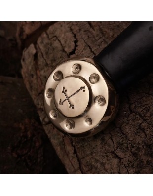 La tunique blanche, agrémentée de liserés noirs, est décorée sur le torse d’un écusson noir et blanc représentant un lion, symbole de force et de royauté.